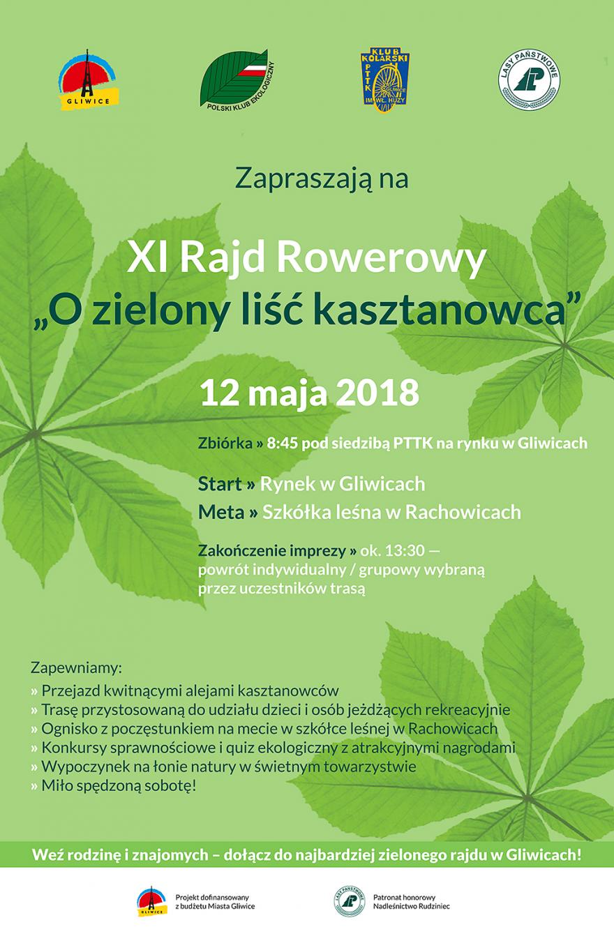 Rajd odbędzie się w tym roku już po raz jedenasty. Rowerzyści wyruszą z gliwickiego Rynku o godzinie 9:00, by tradycyjnie przejechać alejami kasztanowymi powiatu. Wszyscy uczestnicy spotkają się na mecie w szkółce leśnej w Rachowicach, gdzie będą na nich czekać konkursy, gry, zabawy i poczęstunek.
