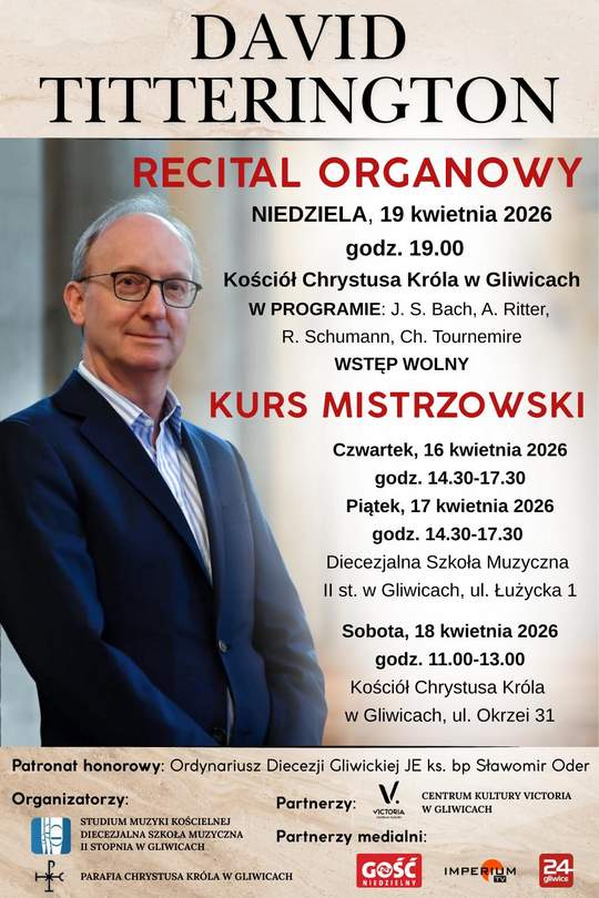 Diecezjalna Szkoła Muzyczna II stopnia, Studium Muzyki Kościelnej oraz Parafia Chrystusa Króla w Gliwicach zapraszają na wyjątkowy recital organowy prof. Davida Titteringtona.