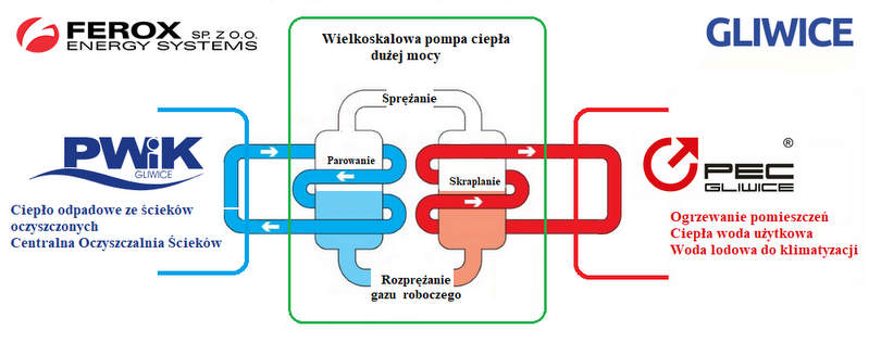 Zastosowana technologia wykorzysta energię odpadową z oczyszczonych ścieków, która zostanie przekształcona w ciepło systemowe zasilające gliwicką sieć ciepłowniczą. Pompa ciepła o układzie dwustopniowego sprężania – oparta na dwóch sprężarkach odśrodkowych współpracujących ze wspólnym ekonomizerem – pozwoli uzyskać wysoką efektywność i temperaturę wody grzewczej sięgającą nawet 90°C.