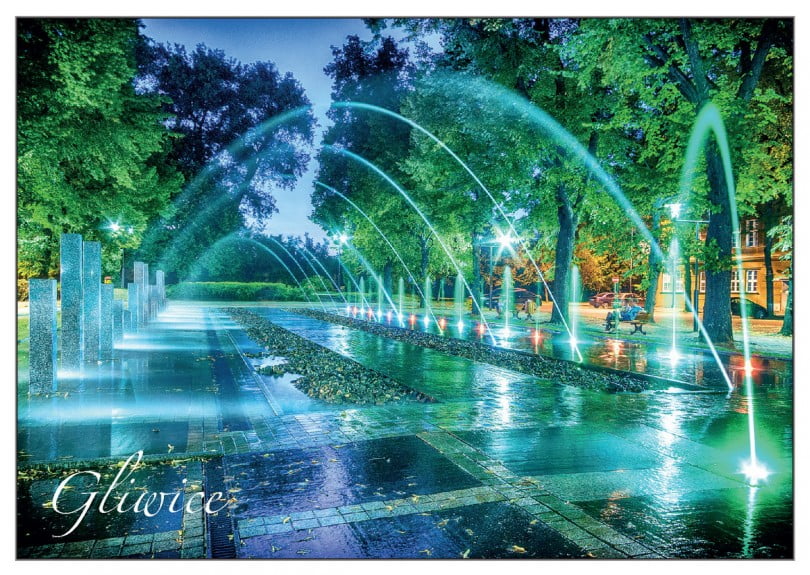 Nie zabrakło także fontanny z Placu Piłsudskiego, a na jednej z kartek pocztowych znalazła się panorama Gliwic, z widocznym na pierwszym planie widokiem Starego Miasta.