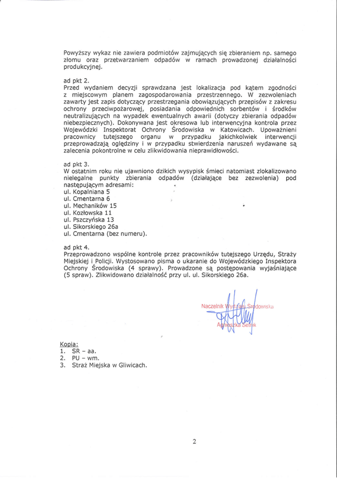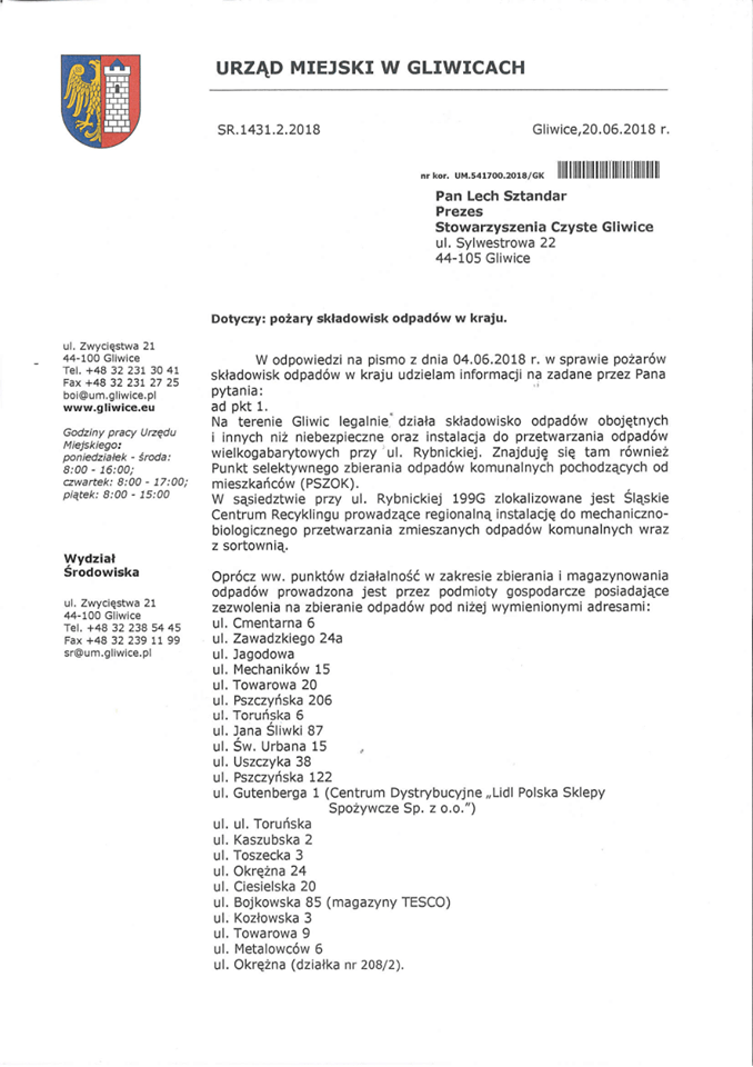 Pytał m.in. o to, ile jest legalnie działających na terenie Gliwic składowisk i magazynów odpadów oraz surowców wtórnych. Interesowały go także nielegalne składowiska ujawnione w ostatnim czasie oraz działania, jakie podjęto celem ich likwidacji i ukarania winnych ich założenia.