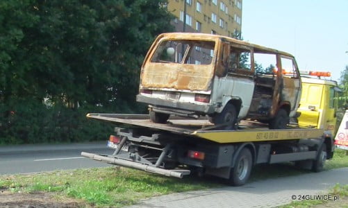 “Słynny” wrak Volkswagena wreszcie usunięty. Spalony samochód od tygodni był wątpliwą ozdobą ulicy Kozielskiej.