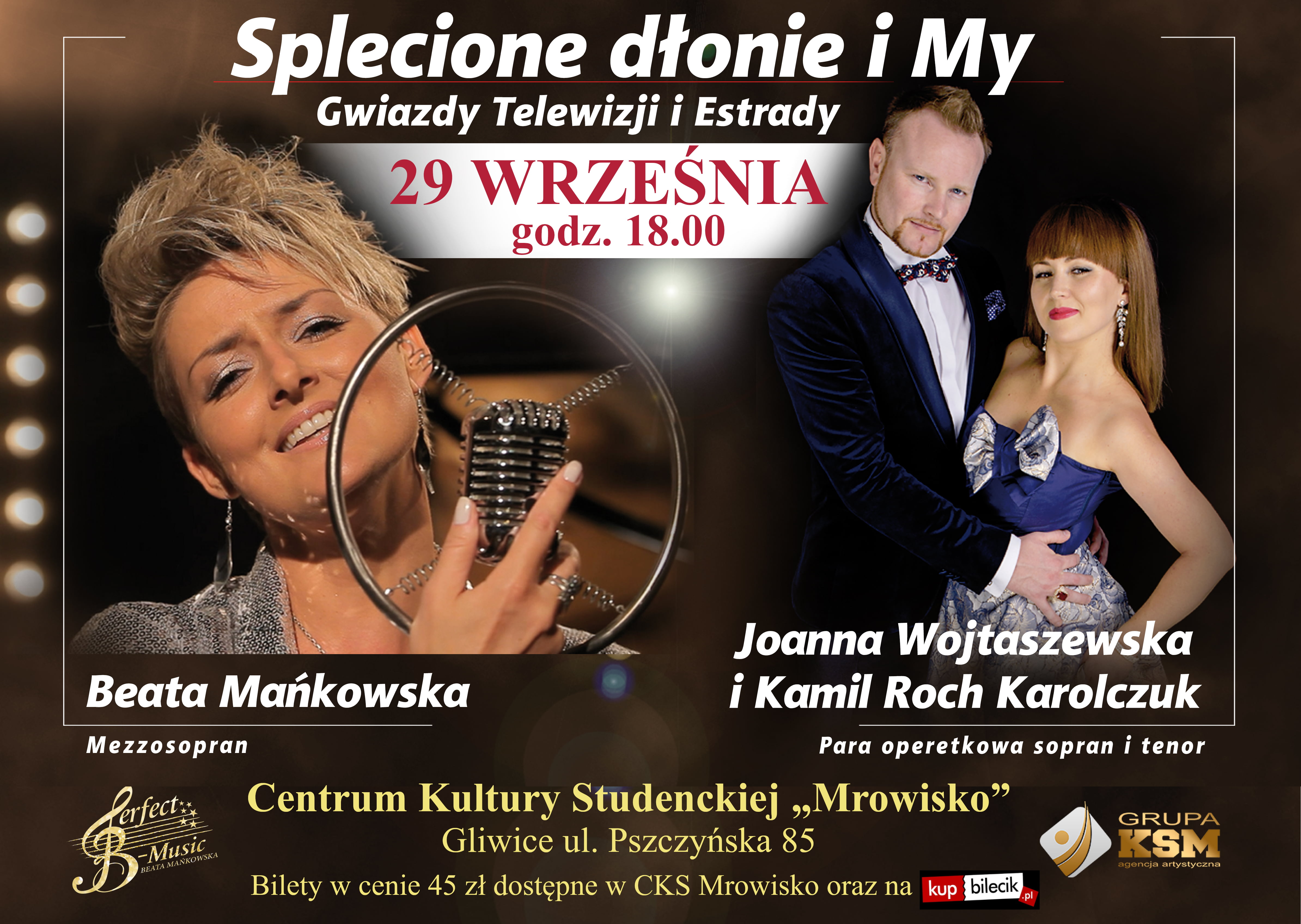 Już 29 września, o godzinie 18:00, w CKS Mrowisko rozpocznie się koncert pt. “Splecione dłonie i My. Gwiazdy Telewizji i Estrady”. Wystąpi Beata Mańkowska wraz z najgorętszą parą operetkową w Polsce