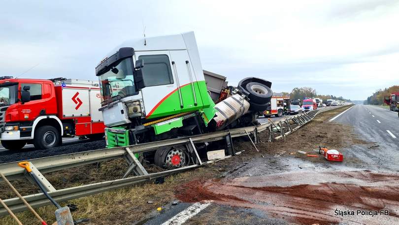 – W wyniku zdarzenia drogowego z udziałem pojazdu ciężarowego przewożącego materiał sypki, droga została zablokowana w kierunku Katowic, a w kierunku Wrocławia ruch odbywa się jednym pasem. Służby kierują na objazdy w kierunku Wrocławia przez DK88, a w kierunku Katowic przez DK40 – przekazuje Śląka Policja.