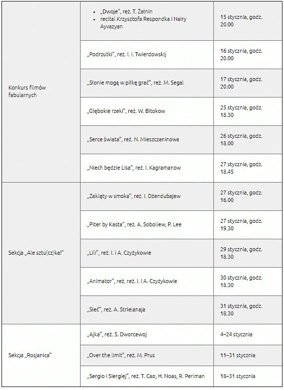 W programie będzie okazja zobaczyć kilka pozycji z konkursu głównego, w tym „Serce świata”, które otrzymało Grand Prix tegorocznego festiwalu oraz „Dwoje”, uhonorowane najcenniejszą dla twórców – nagrodą publiczności. Dodatkowo w kinie Amok zagości sekcja „Rosjanica” – filmy o Rosji, zrealizowane przez nierosyjskich twórców, w tym latynoskich i polskich. Warto też zwrócić uwagę na kontekst „Eurazji”.