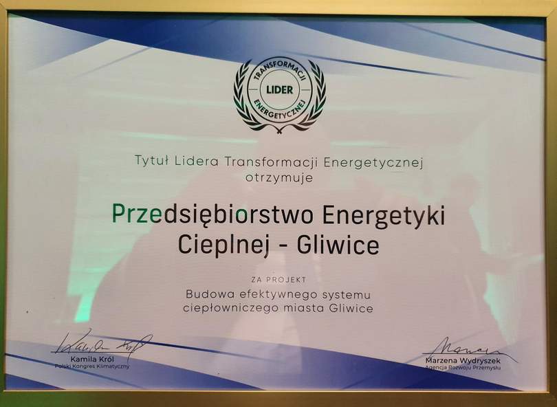 Na zakończonym dnia 20 marca br. Kongresie Klimatycznym w Warszawie wśród nagrodzonych uczestników konkursu w kategorii Inwestycja nagrodę Lidera Transformacji Energetycznej odebrała Miejska Spółka Przedsiębiorstwo Energetyki Cieplej -Gliwice Sp. z o.o. Kapituła konkursu w pierwszym etapie oceny wniosku dopuściła projekt do kolejnej fazy oceny, w której przedstawiono podstawowe kamienie milowe postępującej dekarbonizacji przedsiębiorstwa wraz z przedstawieniem doboru technologii, stosowanych schematów działania, niektórych zamierzeń na poziomie bloków roboczych, bilansów przepływu energii elektrycznej, ciepła oraz efektów środowiskowych i terminów realizacji zamierzeń. Niektóre z nich jak Park Zielonej Energii tj. rozbudowa PEC-Gliwice Sp. z o.o. o kocioł wielopaliwowy, magazyn ciepła, czy panele termiczne znajdują się na etapie pozyskiwania pozwoleń na budowę oraz zamykaniu montażu finansowego. Stosowne wnioski o dofinansowanie zostały złożone i czekają na rozstrzygnięcia.