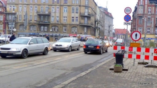 Na ul. Zwycięstwa na wysokości budowy Drogowej Trasy Średnicowej został ustawiony znak drogowy informujący o zakazie ruchu pieszych.
