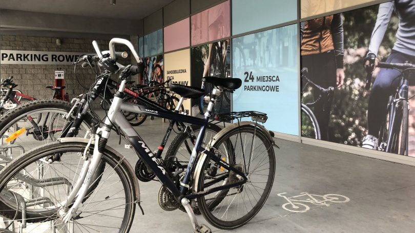 Parking znajduje się przy wejściu od ul. Traugutta i jest nadzorowany w godzinach pracy centrum. Pomieści 24 rowery, a ich posiadacze mają także do dyspozycji samoobsługową mini-stację serwisową.