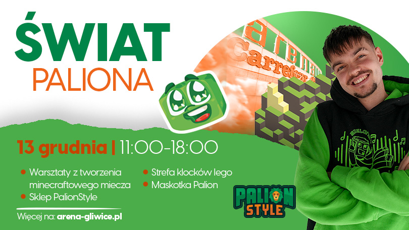 Palion czyli Paweł Palion to popularny w sieci youtuber, influencer, raper i piosenkarz. Ten pochodzący z Siemianowic Śląskich ulubieniec młodszej publiczności znany jest z tworzenia m.in. rozrywkowych treści, w tym filmów związanych z grami video. Jeśli chcecie zrozumieć, kim fascynują się Wasze dzieci, otrzymać od niego prezent, czy kupić coś sygnowanego marką Paliona – zapraszamy do Parku Handlowego Arena! W sobotę 13 grudnia to wszystko będzie możliwe! Co więcej – najmłodsi również będą mogli spędzić czas w świecie swojego idola!