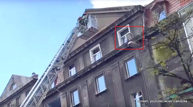 Dwa psy rasy husky wydostały się przez otwarte okno na zewnątrz i chodziły po gzymsie na wysokości 4 piętra kamienicy.