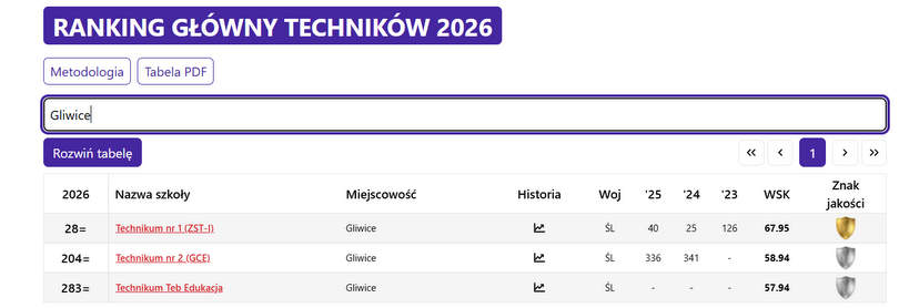 Najmocniejszym punktem gliwickiej edukacji ponadpodstawowej pozostają technika. Technikum nr 1 w Zespole Szkół Techniczno-Informatycznych zajęło 28. miejsce w Polsce w Rankingu Głównym Techników 2026, co lokuje je w ścisłej krajowej czołówce i czyni najwyżej sklasyfikowanym technikum w województwie śląskim.
