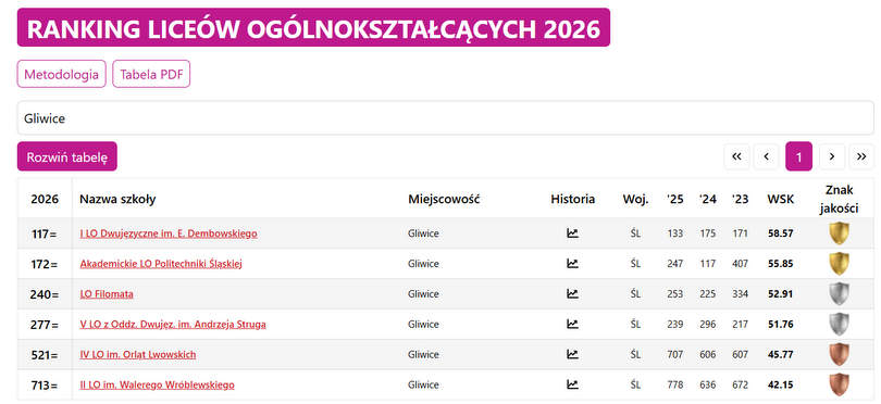 Najwyżej notowaną szkołą ponadpodstawową w Gliwicach pozostaje I Liceum Ogólnokształcące Dwujęzyczne im. Edwarda Dembowskiego. W Rankingu Głównym Liceów 2026 zajęło ono 117. miejsce w Polsce, utrzymując pozycję lidera w mieście i plasując się w drugiej setce ogólnopolskiego zestawienia.