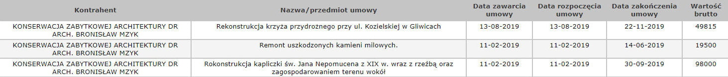 W 2016 roku z kolei łączna kwota umów zawarta z tą firmą wyniosła 172 tys. zł, co przeznaczono na dwie modernizacje – kapliczki i pomnika. W 2015 rekonstrukcje krzyża i kapliczki pochłonęły 178 tys. zł.