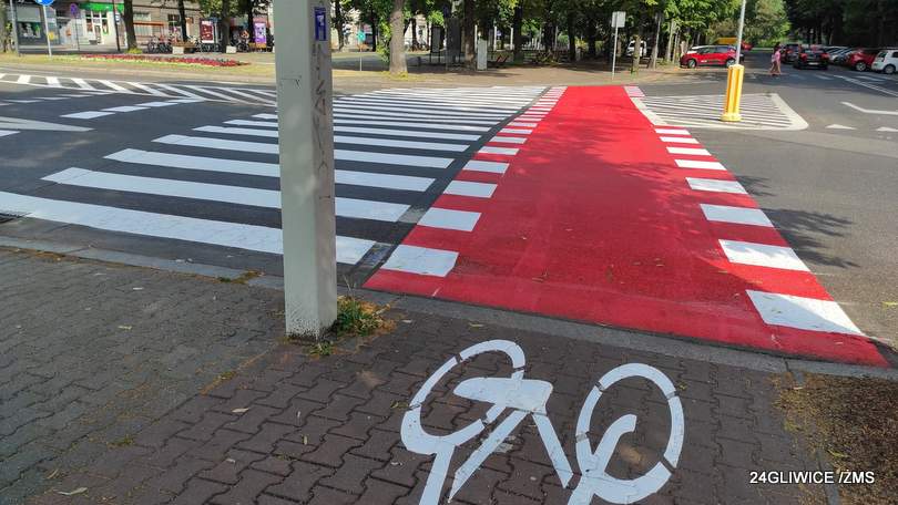Przejazdy dla rowerów w Gliwicach wyróżniono za pomocą mocnej czerwonej farby. Chodzi o bezpieczeństwo. Bo zaznaczone wyłącznie białą linią nie były wystarczająco widoczne dla kierowców samochodów. Dlatego często nie ustępowali oni jednośladom pierwszeństwa.