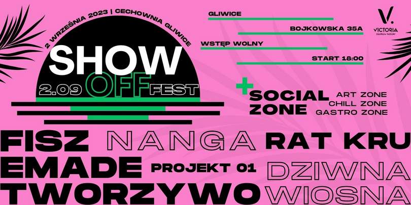 – Show Off Fest od pierwszej edycji zaprasza artystów-muzyków, którzy ciągle poszukują nowego brzmienia – lub już znaleźli własną drogę. Piszą bardzo dobre teksty i komponują muzykę obok, której trudno przejść obojętnie. Możemy ich spotkać na letnich, plenerowych festiwalach, m.in.: Off, Opener, Męskie Granie, Pol’and’Rock, Letnie Brzmienia. Wszyscy świetnie wypadają na żywo, a to dla nas jest najważniejsze. Zapraszamy na wyjątkowe, koncertowe pożegnanie wakacji. – mówi Łukasz Kwaśniewski, zastępca dyrektora Centrum Kultury Victoria w Gliwicach.