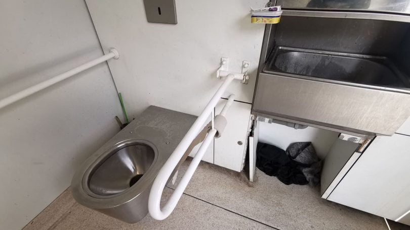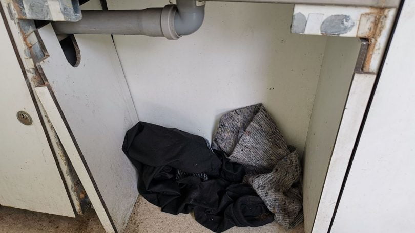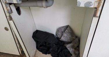 W rogu toalety stała stara, brudna szczotka do WC. Pod umywalką zdemontowana ścianka, a we wnęce stare, śmierdzące ubrania – prawdopodobnie od jakiegoś bezdomnego. Na szczęście właściciela nie było wewnątrz. W kątach brud.