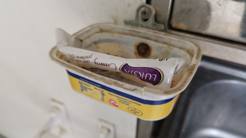 Mydła w płynie nie było. Taki stan prawdopodobnie utrzymuje się już od dłuższego czasu, bo obok lustra przykręcono pudełko po serku homogenizowanym (tak mi się wydaje). Wewnątrz papierek po mydle w kostce – samego mydła nie było. Zresztą ta pseudomydelniczka była tak brudna, że chyba bym nawet nie skorzystał.