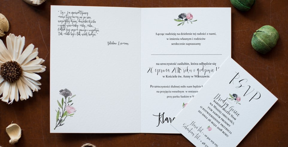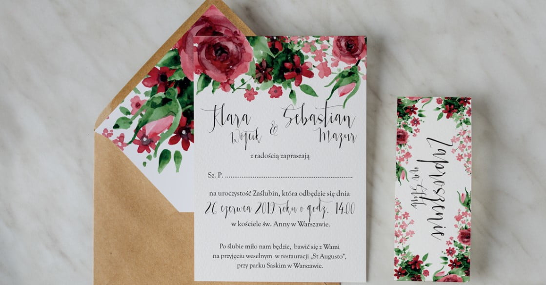 Na samym początku warto pamiętać, że zaproszenia to jedna z części papeterii ślubnej. Każdy z elementów powinien być spójny z całością. Dlatego jeśli wybieracie np. zaproszenia z motywem kwiatowym, to później postarajcie się go powtórzyć na winietkach i na zawieszkach na butelki z alkoholem.