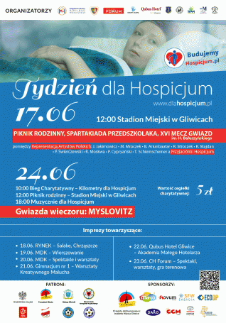 Wszystkie wydarzenia w ramach Tygodnia dla Hospicjum będą rozpoczynać się o godz. 12.00. [perfectpullquote align=”full” cite=”” link=”” color=”” class=”” size=””]Cykl imprez 17 czerwca zacznie się Spartakiadą Przedszkolaka na Stadionie Miejskim w Gliwicach (ul. Okrzei 20), pełnym atrakcji piknikiem dla gliwickich rodzin oraz XVI Meczem Gwiazd im. Henryka Bałuszyńskiego między Reprezentacją Artystów Polskich (RAP) oraz Przyjaciółmi Hospicjum.[/perfectpullquote]