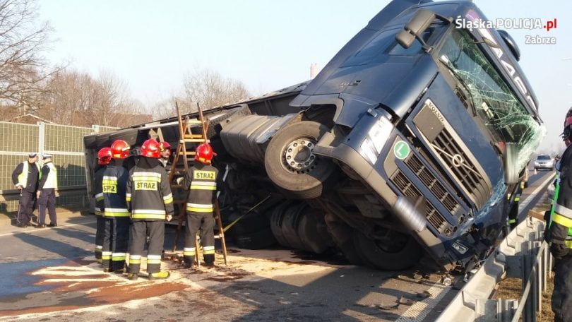 Do zdarzenia doszło w poniedziałek, na zabrzańskim odcinku Drogowej Trasy Średnicowej tuż za wjazdem z ul. Rymera. [perfectpullquote align=”full” bordertop=”false” cite=”” link=”” color=”” class=”” size=””]Kierujący ciężarowym volvo, jadąc w stronę Gliwic, z nieustalonych przyczyn doprowadził do przewrócenia pojazdu na jezdnię i zablokowania trzech pasów ruchu. [/perfectpullquote]