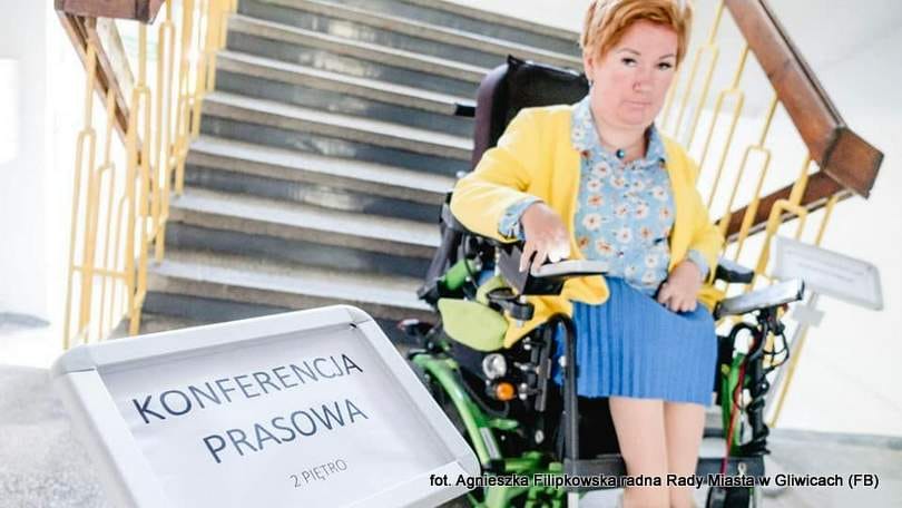Radna Agnieszka Filipkowska, która porusza się na wózku elektrycznym, przybyła na konferencję prasową związanym z uroczystym otwarciem – Gliwickiej Przystani 35 przy ulicy Warszawskiej, na miejsce jednak nie dotarła. Dlaczego? Przez bariery architektoniczne.