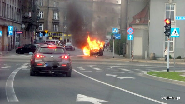 – Na miejscu zdarzenia nasi funkcjonariusze poza płonącym Volkswagenem zastali policyjny patrol Wydziału Ruchu Drogowego, któremu udzielono wsparcia w zabezpieczeniu niebezpiecznego terenu, do momentu przyjazdu Straży Pożarnej i ugaszenia przez nią ognia. Chwilę później przybyli strażacy, którzy uporali się z pożarem – informuje gliwicka Straż Miejska i publikuje zdjęcie pożaru.