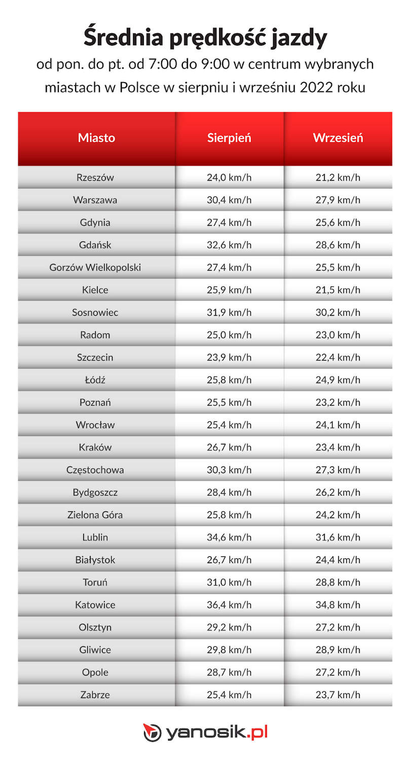 “Najwolniejszymi” miastami w Polsce okazały się Wrocław, Kraków i Olszyn, gdzie zbadana średnia prędkość to ok. 32 km/h!