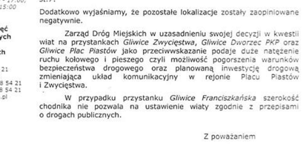 – Zarząd Dróg Miejskich w uzasadnieniu swojej decyzji w kwestii wiat na przystankach Gliwice Zwycięstwa, Gliwice Dworzec PKP, Gliwice Plac Piastów jako przeciwwskazanie podaje duże natężenie ruchu kołowego i pieszego, czyli pogorszenie warunków bezpieczeństwa drogowego oraz planowaną inwestycję drogową zmieniającą układ komunikacyjny w rejonie Placu Piastów i Zwycięstwa – można przeczytać w odpowiedzi urzędników.