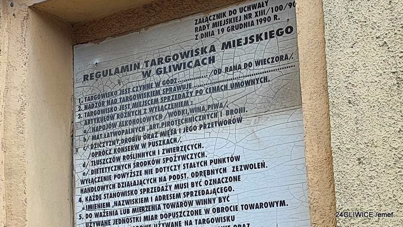 Większość punktów przeniosła się w inne miejsca, o latach handlowego prosperity przypomina już tylko spękana i wypłowiała tablica z regulaminem “targowiska miejskiego w Gliwicach”.