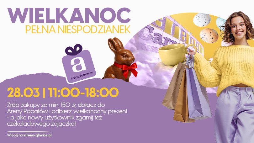 Jak go otrzymać? Wystarczy tego dnia, w godz. 11.00 – 18.00, przyjść na zakupy i wydać przynajmniej 150 PLN (na maksymalnie dwóch paragonach) oraz być członkiem naszego programu lojalnościowego ARENA Rabatów. Przypominamy, że ARENA Rabatów to specjalny klub dla miłośników zniżek, sekretnych ofert i upominków przyznawanych za zakupy w centrum. Prezenty otrzymają również Ci, którzy dołączą do programu właśnie w sobotę. Do ARENY Rabatów będzie można się zapisać w punkcie promocji. A nowi członkowie, oprócz niespodzianki, otrzymają dodatkowo nieodłączny element Wielkanocy – czekoladowego zająca.