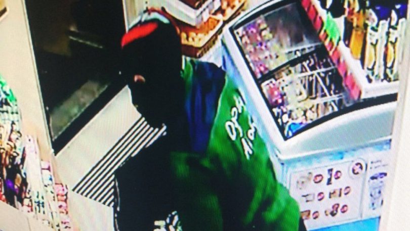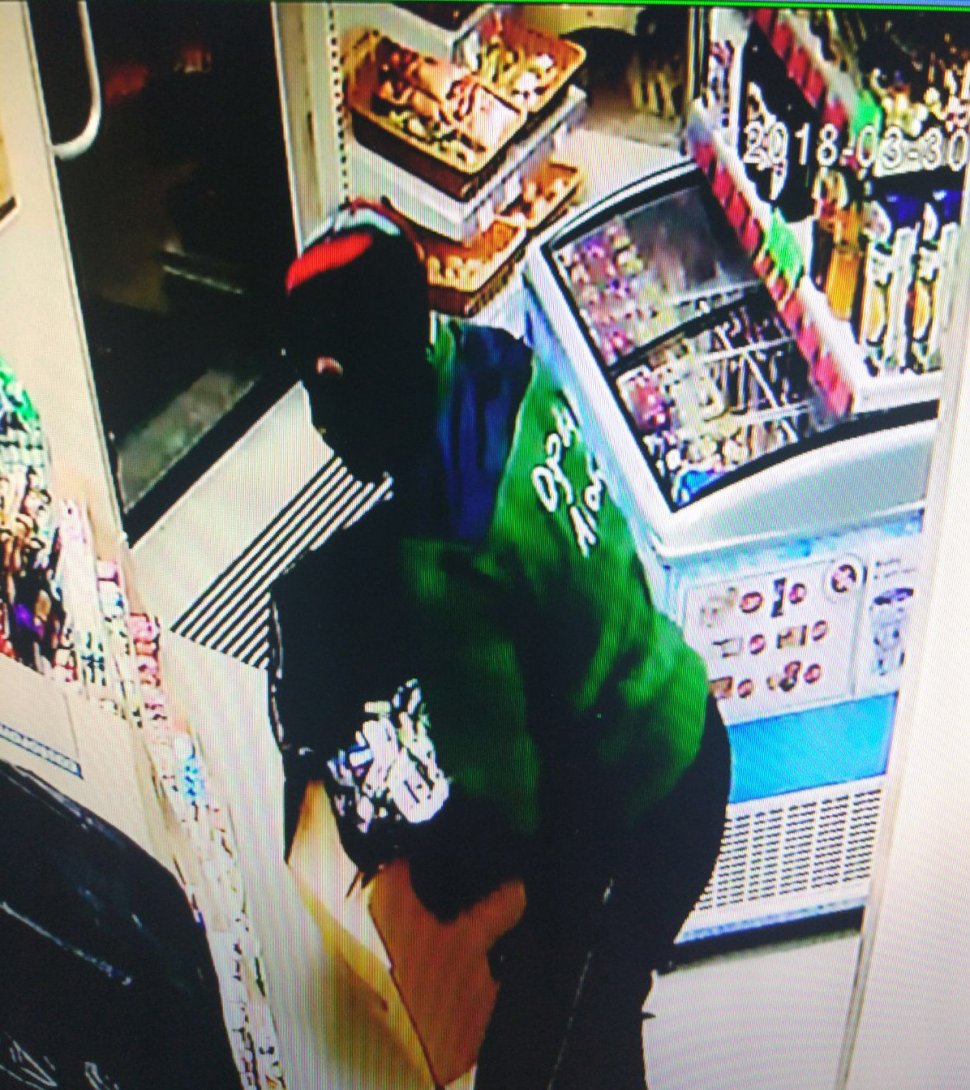 Łupem sprawców padły papierosy (duże ilości) oraz niewielka suma pieniędzy z kasy. Zarejestrowany przez kamery monitoringu mężczyzna jest zamaskowany w kominiarkę jednak ubrany w charakterystyczny zielony dres z napisem.