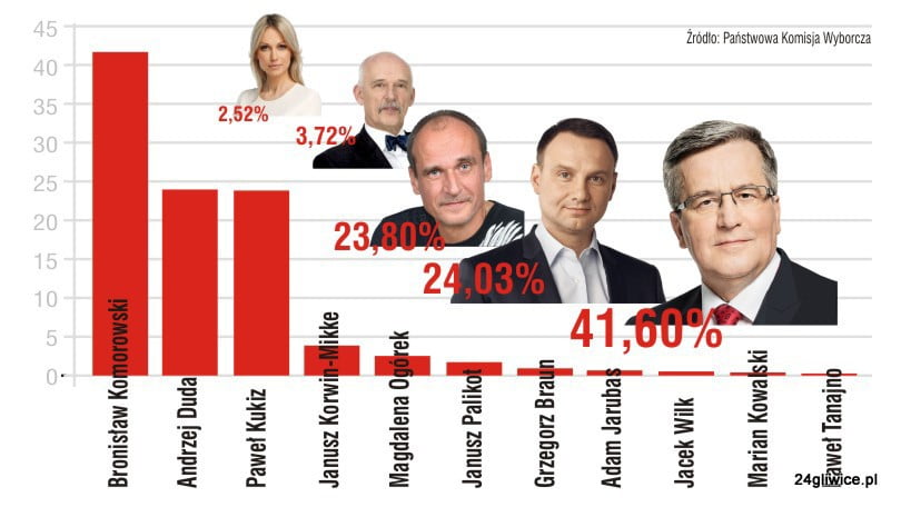 Zwycięzcą pierwszej tury z ponad 41% poparciem został urzędujący prezydent RP Bronisław Komorowski.