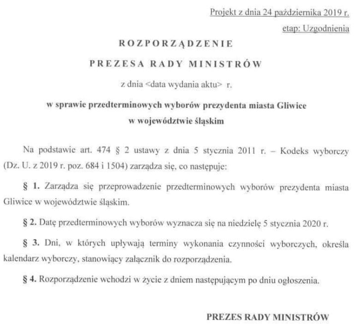 Przedterminowe wybory prezydenckie w Gliwicach odbędą się najprawdopodobniej 5 stycznia 2020 roku. Tak wynika z projektu rozporządzenia Prezesa Rady Ministrów.