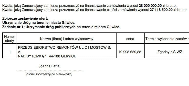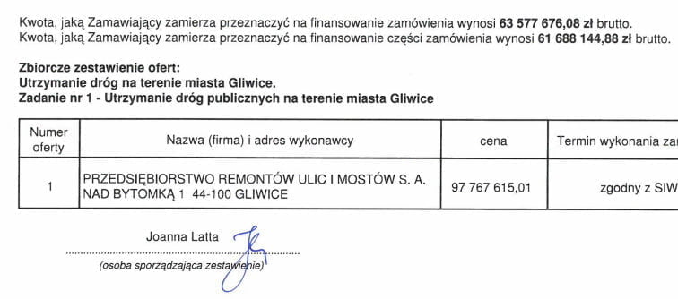 Przypomnijmy, w poprzednim zamówieniu na utrzymanie gliwickich ulic w przyjętym trzyletnim okresie, jedynym oferentem też było Przedsiębiorstwo Remontów Ulic i Mostów, jednak oczekiwania finansowe przekroczyły możliwości ZDM.