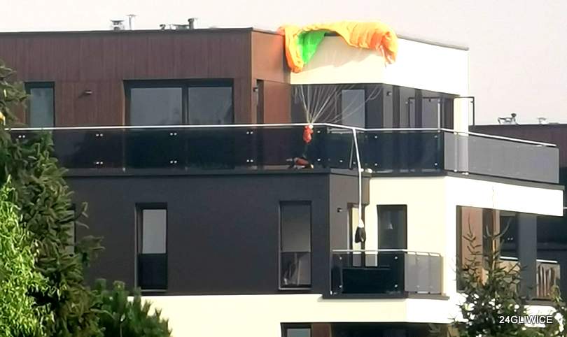“Dyżurny Stanowiska Kierowania Komendanta Miejskiego PSP w Gliwicach przyjął zgłoszenie o upadku spadochroniarza na budynek w Gliwicach przy ul. Toruńskiej. Na miejscu strażacy potwierdzili treść zgłoszenia. Konieczne było dotarcie na balkon budynku na trzeciej kondygnacji, gdzie znajdował się poszkodowany. Udzielono mu kwalifikowanej pierwszej pomocy. Następnie ranny spadochroniarz został przeniesiony na noszach do karetki i przetransportowany do szpitala.”