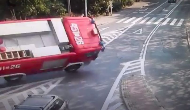 Profil służby-ratownicze udostępnił na Facebooku nagranie z kamer monitoringu, gdzie widać moment wywrócenia się samochodu strażackiego w centrum Gliwic.