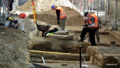 – Jesteśmy w początkowej fazie badań, które powinny potrwać do 3 tygodni. Odkryliśmy konstrukcje drewniane, których badanie zawsze zajmuje trochę więcej czasu – chcemy m.in. określić datę ścięcia drzewa. Konstrukcje nie są tak dobrze zachowane jak przy wcześniejszym odkryciu na ul. Plebańskiej, ale prawdopodobnie są to fragmenty drogi z XIV wieku – mówi archeolog Jacek Pierzak z biura Śląskiego Wojewódzkiego Konserwatora Zabytków.