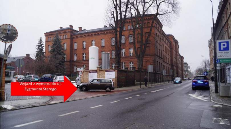Uwaga: będzie obowiązywał ruch jednokierunkowy. Pacjenci na wymaz będą wjeżdżać na teren szpitala bramą od ul. Kościuszki, a wyjeżdżać na ul. Zygmunta Starego.