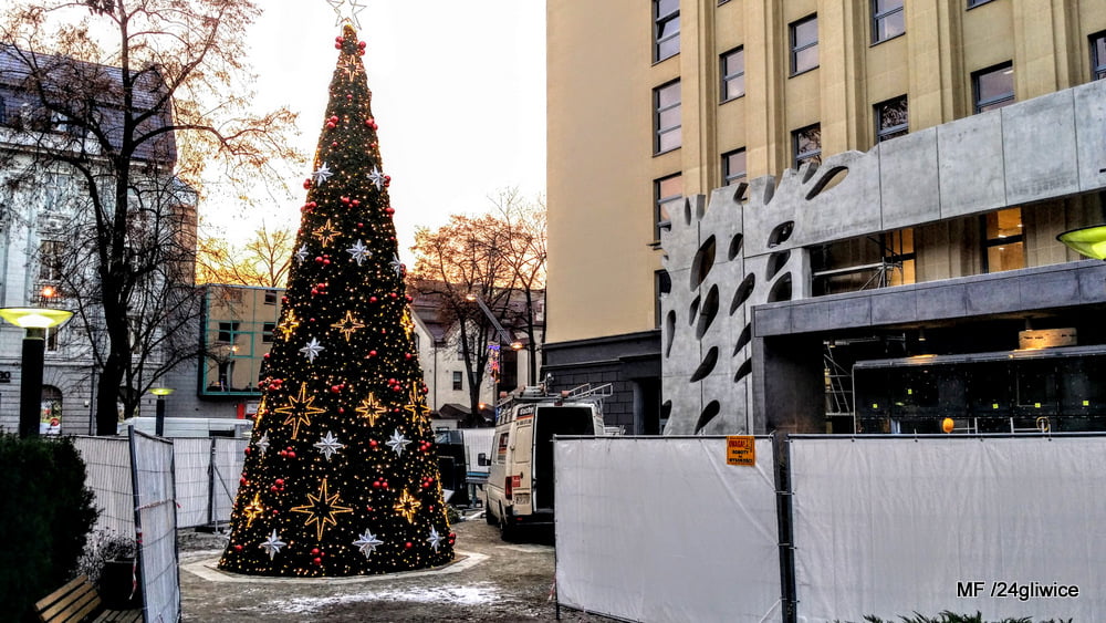 Zupełnie nowe drzewko świąteczne pojawiło się przed remontowanym Urzędem Miejskim, w miejscu czasowo zdemontowanych faunów. Choinka może się podobać, ale biorąc pod uwagę trwające prace i ogólny rozgardiasz, czy nie ustawiono jej tu trochę za wcześnie? Fot: MF