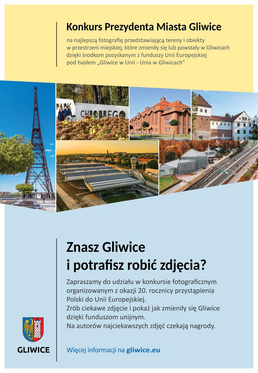 Wielkimi krokami zbliża się wiosna, a wraz z nią obchody 20-lecia członkostwa Polski w Unii Europejskiej. W Gliwicach jubileuszowych atrakcji nie zabraknie… Na początek zapraszamy do udziału w marcowym konkursie Prezydenta Miasta Gliwice na najlepszą fotografię przedstawiającą tereny i obiekty w przestrzeni miejskiej, które zmieniły się lub powstały w Gliwicach dzięki środkom pozyskanym z funduszy Unii Europejskiej.