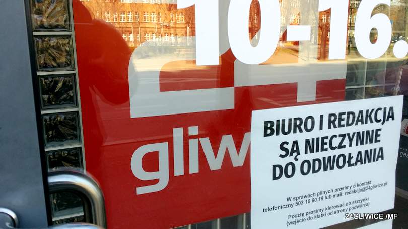 Od piątku 13 marca, biuro przy pl. Piłsudskiego 3 jest nieczynne DO ODWOŁANIA. Część dziennikarzy pracuje zdalnie. Kontakt z redakcją odbywać się będzie poprzez e-mail (redakcja@24gliwice.pl) oraz w pilnych sprawach w dni robocze pod numerem telefonu 503-10-60-19 w godz. 12-16:00.