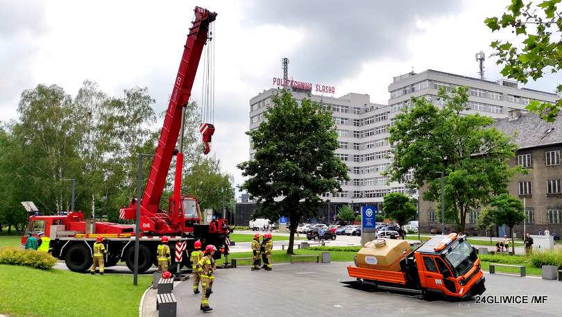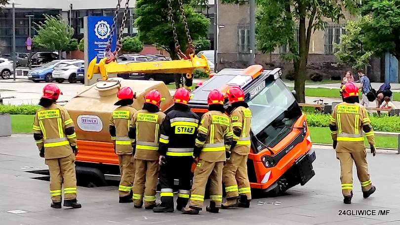 Kilka lat temu dostawczy Polonez, dzisiaj samochód Miejskiego Zarządu Usług Komunalnych. Fontanna pułapka przed Wydziałem Budownictwa Politechniki Śląskiej znowu “pochłonęła” auto prowadzone przez kierowcę, który najwyraźniej nie zdawał sobie sprawy z delikatnej konstrukcji kryjącej się pod płytami.