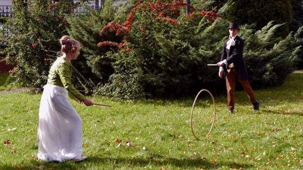 – Dziunia i ja starałyśmy się zjeść jak najprędzej nasze śniadanie i wybiec na ganek, gdzie stał wózek pleciony na kołach, pełen kul, młotów i żelaznych bramek do krokietu. Popychałyśmy go po brukowanym, bocznym zjeździe i wyjeżdżałyśmy do parku wzdłuż krzaków spirei pod starą amerykańską sosnę. Na liściach igrało słońce. Pnie drzew otaczały mnie zewsząd, pełne smug świetlnych, albo skąpanych w cieniu. Wózek podskakiwał na korzeniach, które przerastały drogę. (…) Wiedziałam, że dwie godziny upłyną nam na zażartych partiach, w których przeważnie będę pokonana – pisze Janina Żółtowska (Inne czasy, inni ludzie).